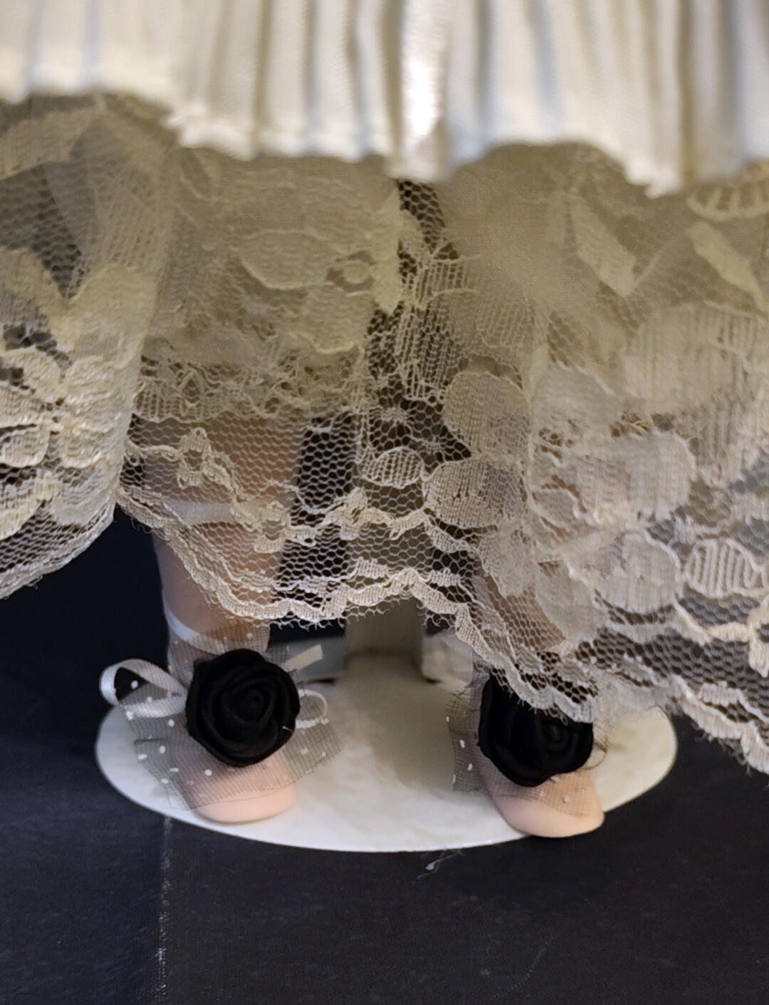 Non indossa scarpe: sui suoi piedi, delicate rose nere si legano come sigilli silenziosi, testimoni del suo cammino fra sogno e veglia.